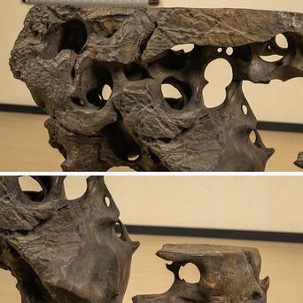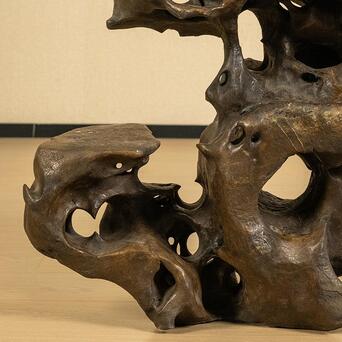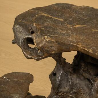 此品正是一例少见的灵璧石天然几,整体为一整块体量不俗的灵璧石,其历经岁月沉淀、风雨侵蚀,故体表多处褶皱迭起,孔洞串连,但整体仍能稳健立地,不摇不晃,且顶部还有天然形成的一个平面,可作几面承托杂物,以手摩挲时,也不会有很强的滞涩之感,实为难得。